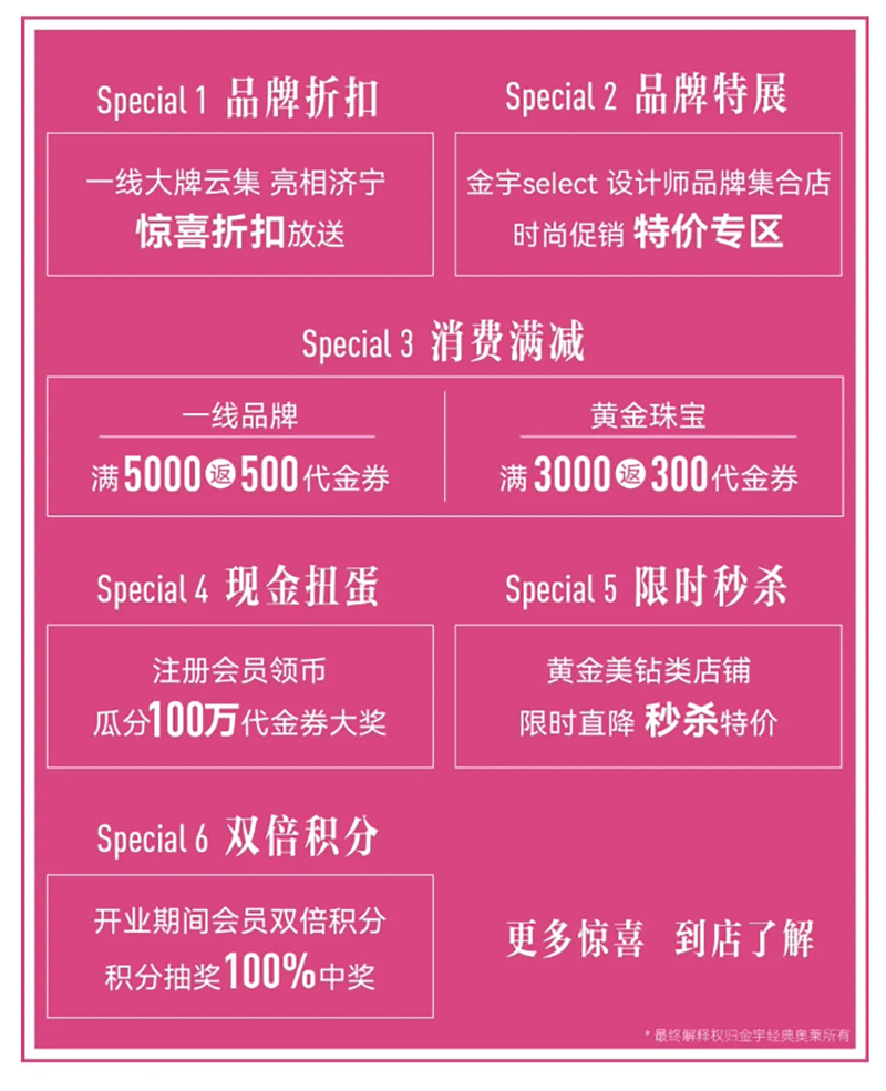 隨著金宇經(jīng)典奧萊的開業(yè),濟(jì)寧國際生活節(jié)正式拉開序幕。以回饋濟(jì)寧人為目的,制造濟(jì)寧人自己的時(shí)尚地盤,4.29-5.30盛惠不止狂歡不停,覆蓋五一黃金周,推出大量優(yōu)惠活動(dòng),時(shí)尚秀場(chǎng)、live演出、驚喜折扣、雙倍積分、現(xiàn)金扭蛋等,回饋廣大市民朋友!