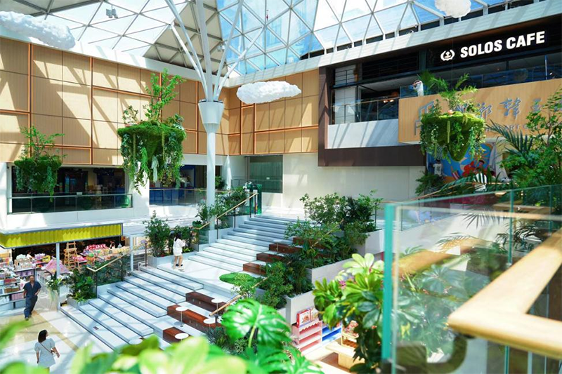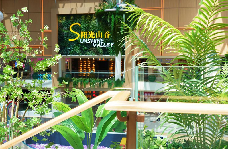 通過填補主中庭和動線調(diào)整等手段,設(shè)計團隊共打造了“云光”“藝境”“SHOW TIME” 、“陽光山谷”四大主題空間,分別對應(yīng)“美妝-云光之下的時尚美學”“生活-探尋生活中的靈感意境”“潮&趣-年輕力探索中心”“藝術(shù)-綠色有機陽光山谷邂逅藝術(shù)與美食”主力場,增強了品類與空間氛圍的聯(lián)結(jié)性,使一二三期動線順暢連通,有效拉動客流向上走。其中七樓的“陽光山谷”跨層主題空間,將自然生態(tài)的綠植元素和本地的河川山谷地貌滲透其中,把自然河谷的流線設(shè)計與室內(nèi)整體動線的層次結(jié)合,增加了商場的游逛體驗。