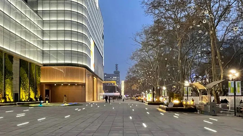 室外兩面的廣場區(qū)域分別被設(shè)計為憩(水秀廣場)、聯(lián)(商業(yè)步行通廊)、迎(慶典廣場)、趣(彈性劇場)、達(地面停車場/生活超市)五大部分,每個部分都將標識、景觀鋪裝、綠植、親水景觀、多媒體藝術(shù)裝置等與建筑整體設(shè)計風格進行了統(tǒng)一,融合了現(xiàn)代、藝術(shù)、科技與綠色的室外區(qū)域營造出了宜人舒適的氛圍。